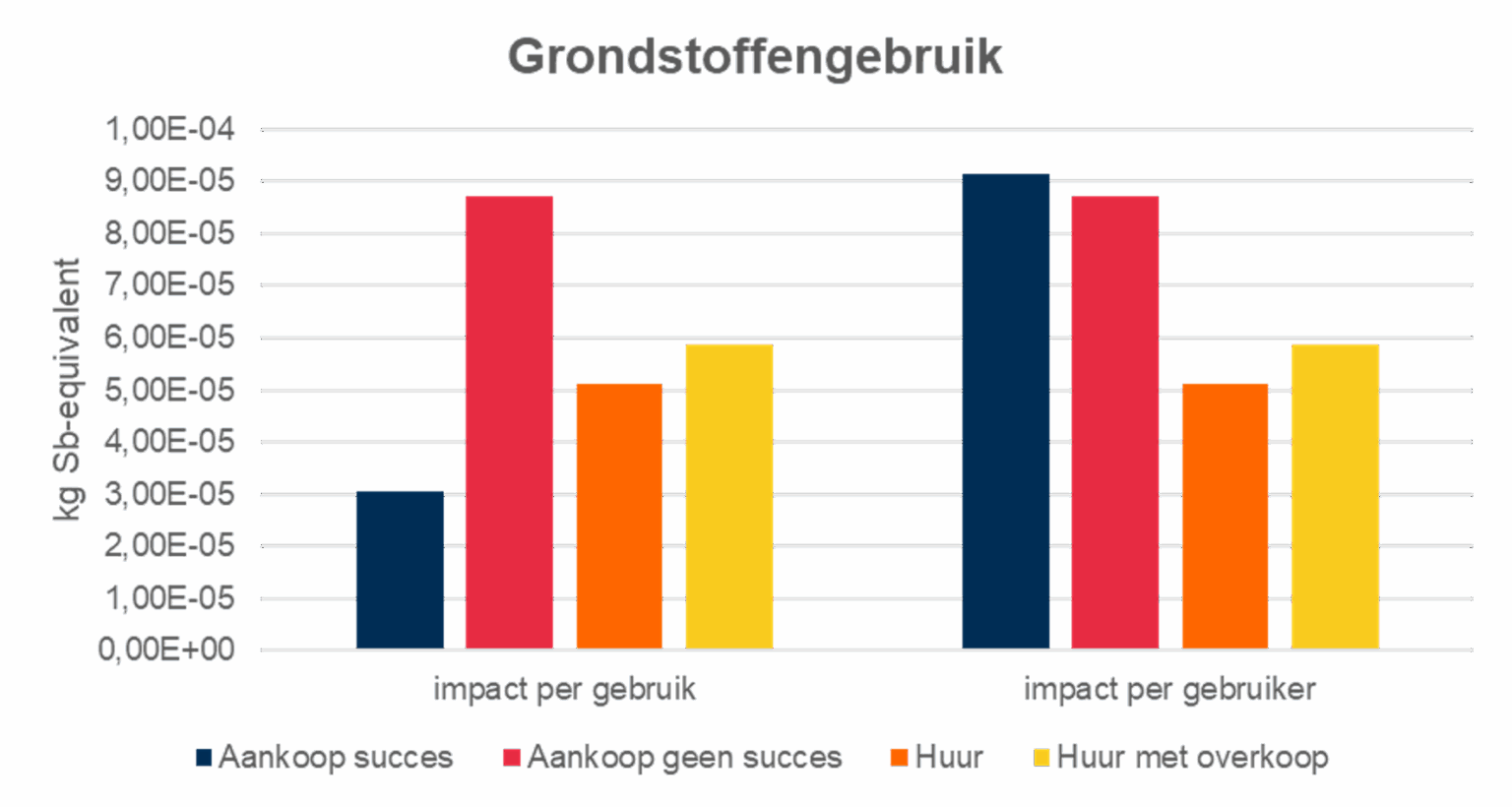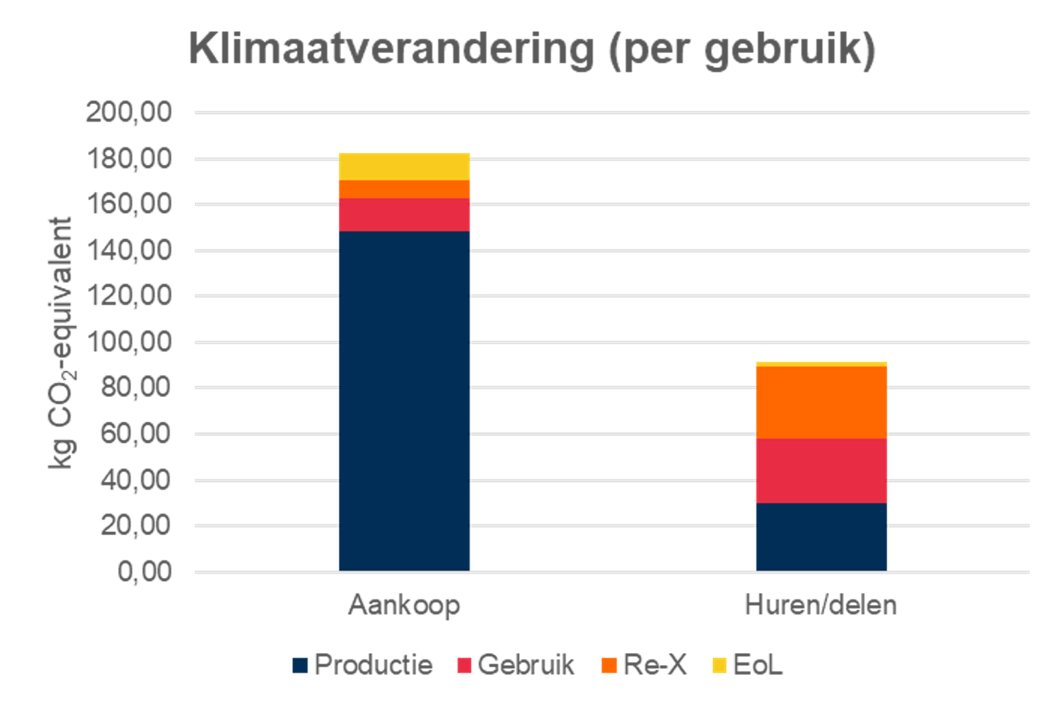 De milieu-impact van een product doorheen zijn levenscyclus wordt in veel gevallen voornamelijk bepaald door de productiefase, vooral wanneer producten slechts beperkt worden gebruikt. In huur- en deelsystemen verschuift dit evenwicht: het relatieve aandeel van de gebruiksfase neemt toe in de totale milieu-impact, al worden er vaak milieuwinsten geboekt op het geheel. De uitgevoerde analyses bevestigen dat huren en delen in het bijzonder relevant is voor producten met een hoge productie-impact, aangezien deze impact kan worden verspreid over meerdere gebruikers en gebruikscycli. Tegelijkertijd tonen gevoeligheidsanalyses aan dat het maximaliseren van de gebruiksintensiteit een cruciale voorwaarde is om de beoogde milieuvoordelen te realiseren. Voor producten die een hoge impact genereren tijdens de gebruiksfase (bijvoorbeeld door gebruik van benzine of elektriciteit) in verhouding tot de productiefase, is het nog steeds van belang om onderbenutting tegen te gaan maar zijn de milieuvoordelen van een huur- of deelmodel niet gegarandeerd.