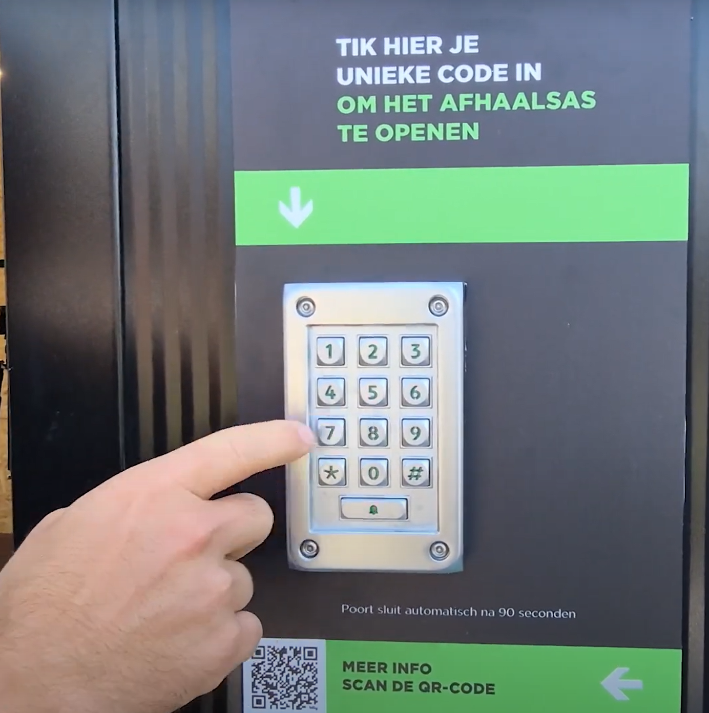 Het systeem werkt verrassend eenvoudig. Klanten bestellen hun materiaal zoals gewoonlijk, vermelden dat ze het buiten de openingsuren willen afhalen, en krijgen hun unieke code. “De poort blijft twee minuten open en sluit dan automatisch. Simpeler kan niet.”